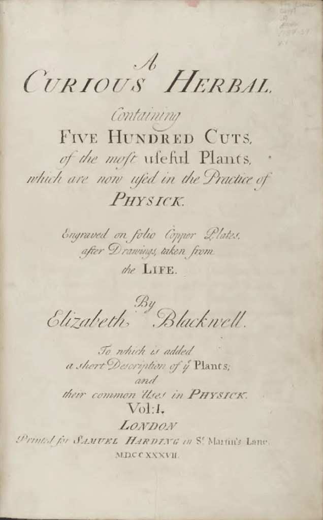 “From 1737 to 1739, Elizabeth Blackwell studied important medicinal plants in London’s Chelsea Physic Garden, some of which were from the New World. She drew from live specimens in unprecedented detail, engraved the drawings on copper plates and hand-colored 500 images in all. The Society of Apothecaries, founders of the Garden, helped support her work as did several prominent doctors in the